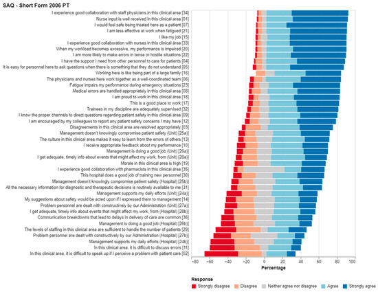 In order to evaluate the internal consistency of the present survey, Cronbach’s alpha (α) was determined: total SAQ-Short Form 2006 PT, α = 0.93; team environment (items 1–6), α = 0.79; safety climate (items 7–13), α = 0.82; job satisfaction (items 15–19), α = 0.91; stress recognition (items 20–23), α = 0.88; management perception (items 24–29), α = 0.89; and working conditions (items 30–32), α = 0.72.