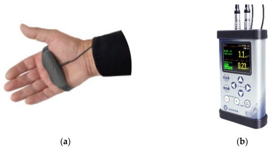 (a) Sensor placed on the worker’s hand; (b) SVAN 106 Four-Channel Sound and Vibration Analyser.