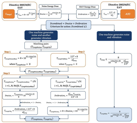 For the sake of clarity, the following Figure 4 shows a flowchart of the proposed methodology for the main two cases of only one source of exposure (i.e., a machine generates both noise and HAV), and the case when the exposure to these physical agents originates from different noise and HAV sources.