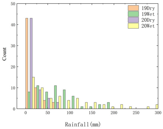The average monthly rainfall in 2019 was 11.46 mm in the dry season and 68.91 mm in the wet season. The average monthly rainfall in 2020 was 18.24 mm in the dry season and 96.87 mm in the wet season. Average monthly rainfall was slightly higher in 2020 than that in 2019 (Figure 2).