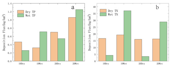 Atmospheric nitrogen and phosphorus deposition fluxes in dry and wet seasons. (a) Dry and Wet TP deposition; (b) Dry and Wet TN deposition.
