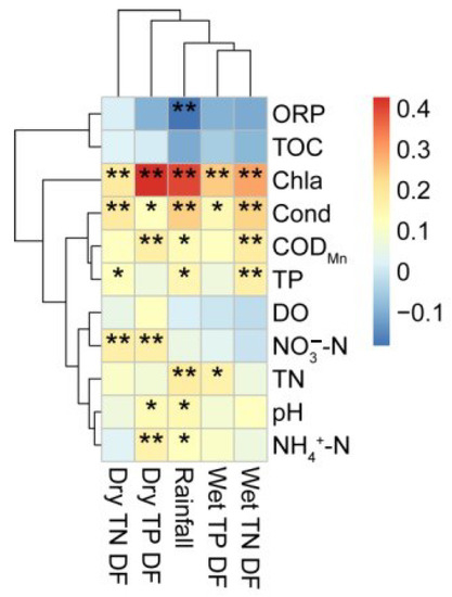 Figure 4 provides the relationship between atmospheric nitrogen and phosphorus deposition fluxes and rainfall and water quality factors. Pearson’s correlation analysis was used to determine the relationship between atmospheric deposition and water quality. The deposition flux of wet TN was significantly positively correlated with Chla, Cond, CODMn and TP at 0.01 level. Rainfall was positively correlated with Chla, Cond, CODMn, TP, TN, pH, and NH4+-N and negatively correlated with ORP at 0.01 level. We can clearly find that the deposition flux of wet TP was positively correlated with Chla, Cond and TN. The deposition flux of dry TP was positively correlated with Chla, Cond, CODMn, NH4+-N, NO3−-N and pH. The deposition flux of dry TN was positively correlated with Chla, Cond, TP and NO3−-N.