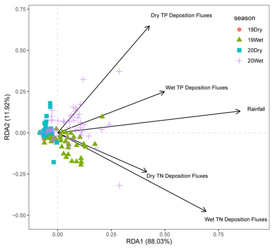Detrended correspondence analysis shows that the maximum gradient lengths of the four axes are all less than 3. Therefore, we chose the RDA linear model, as shown in Figure 5. The RDA results are shown in Figure 5. The interpretation amount of the RDA1 axis and RDA2 axis was 88.03% and 11.92%, respectively. From the perspective of time, TN deposition flux had a significant impact on the water quality of the trunk canal in 2019, while TP deposition flux and rainfall had significant impacts on the water quality of the trunk canal in 2020. The dry TP deposition flux and wet TP deposition flux have a more significant impact on the water quality in the wet season in 2020, and the dry TN deposition flux and wet TN deposition flux have a more significant impact on the water quality in the wet season in 2019. The impact of rainfall on water quality was more pronounced during the wet season in 2019 and 2020.