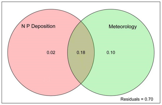 Although the atmospheric deposition of N and P was less than that of other sources leading to the eutrophication of water, it still contributes to the concentration of N and P in water. VPA analysis showed that atmospheric N and P deposition and atmospheric environmental factors contributed 18% to the explanation of water quality (Figure 6). Although the contribution of N and P deposition to water quality is not high at present, according to the research results on the increase of atmospheric N and P deposition in the past two years, the atmospheric N and P deposition, especially the P deposition load, will increase greatly in the future. Therefore, under the condition that exogenous nitrogen and phosphorus input from point and non-point sources is gradually controlled, the contribution rate and ecological impact of atmospheric N and P deposition on water pollution of main channels will become larger and larger, which needs to be paid enough attention to.