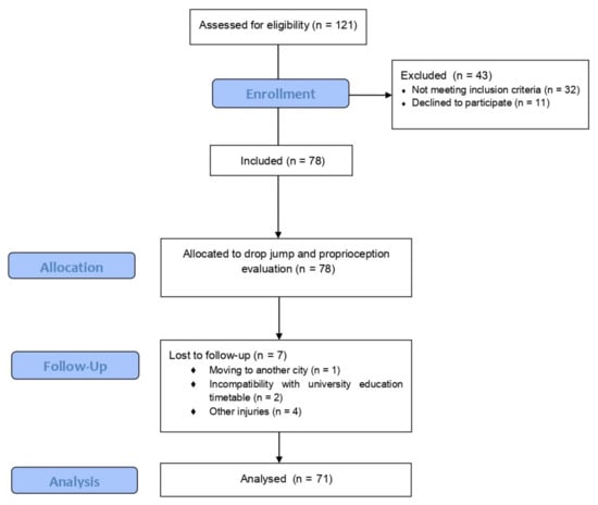 The sample size was calculated through GRANMO application version 7.12 (Spain). Accepting an alpha risk of 0.05 and a beta risk of 0.2 in a two-sided test, 66 participants were needed, with a correlation coefficient of 0.35, and anticipated drop-out rate of 5%. Eighteen female basketball teams (182 basketball players) from the regional female basketball league were contacted, although only 12 agreed to participate (80.1%) (121 female basketball players). As eligibility criteria, participants should be between 17 and 35 years old, have a sports license to play in the regional female basketball league, not have had severe injuries (leading to more than three weeks absence from sport) during the previous six months, and not be using hormonal contraceptives (due to its action to regulate hormonal parameters and decrease injury risk) []. Therefore, 78 female basketball players were eligible and voluntarily participated. The follow-up was completed in 71 players. Three players gave up the basketball competition due to personal issues (incompatibility with university education timetable or moving to another city) and four players suffered an injury in other anatomical regions (upper limb or head) (Figure 1). Before participation, all basketball players and/or their legal guardians were informed about the study and signed an informed consent form. The ethics committee of the local university approved this study (Ref. No: 116CER19).