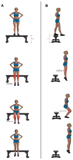 During the basketball preseason, body mass and height were assessed in all participants by using a ±100-g precision digital weight scale (Tefal, Rumilly, France) and a t201-t4 adult height scale (Asimed, Barcelona, Spain), respectively. Additionally, all players provided data about their age, basketball experience, leg dominance (leg used to kick a ball), and menstrual regularity cycle (women were asked about their last three menstrual cycles; regular menstruation was considered for those cycles between 24–38 days of frequency, 7–9 days of variation, and 8 days or less of flow; irregular menstruation was considered for any variation of these three parameters) []. In the same session, all players performed a lower limb proprioception test and a DJ test. The order to perform both tests was always randomized by using a web-based software (randomizer.org). Before the evaluation, participants completed a 15 min warm-up consisting of 5 min jogging, 5 min ballistic stretching, and 5 min basketball and running exercises. All players performed the baseline assessment at their sports facilities and wore tight-fitting shorts and low-cut athletic shoes. The testing session was supervised by five experienced physiotherapists who instructed all players to perform the warm-up and tests. After warming up and prior to performing the tests, our physiotherapists demonstrated the proprioception test and jump technique. Thus, all players had at least two trials to ensure the familiarization process of both tests. Then, to ensure consistency, a physiotherapist was responsible for attaching reflective markers to each participant in the following anatomical references of both lower limbs: (1) greater trochanter, (2) lateral femoral condyle, (3) fibular neck, (4) lateral malleolus, (5) anterior superior iliac spine, (6) center of the patella, and (7) ankle joint center (middle distance between malleoli, 1 cm distal to lateral malleolus, according to Eng and Winter). Marker locations were based on previous studies []. Despite the fact that 3D analysis represents the gold standard research tool, 2D analysis assessment of frontal and sagittal plane joint motion has been demonstrated to be a good alternative to estimate knee joint angles in sport population [,]. As advantage, filming screening tests with ordinary video cameras is a low-cost and time-efficient method that may be easily standardized []. For this reason, this methodology has been highly employed by sports and health professionals in field conditions [] and considered valid for many previous studies [,].