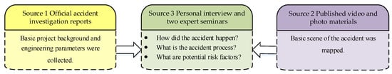 The project context of the FPCA was gathered from multiple sources (Figure 1). The basic project background and engineering parameters were collected from official accident investigation reports. Published video and photo materials related to the FPCA were collected at the same time to map the scene of the accident. Specifically, personal interviews and two expert seminars were conducted by inviting six experienced domain experts, involving three civil engineering scholars and three engineering practitioners from Jiangsu projects. During the seminars, the accident process and involved potential risks were stated and discussed. Then, the case study on FPCA was carried out based on the organized accident information materials.