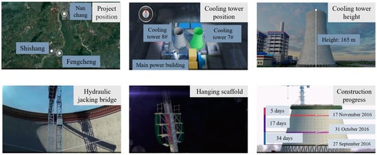The Jiangxi Fengcheng Power Plant phase III expansion project belongs to the key power construction project of Jiangxi Province, with a total investment of 7.67 billion Yuan (about 1.2 billion US dollars). Cooling tower 7, which was 165 m tall and was made of reinforced concrete, was located northeast of the main plant. The construction of the drum wall adopted the hanging scaffold turning over the process, and a hydraulic jacking bridge was arranged inside the tower. The construction of cooling tower 7 started on 11 April 2016. By the time of the accident, the 52nd section of the tube wall concrete was poured to a height of 76.7 m. An overview of the project is shown in Figure 2.