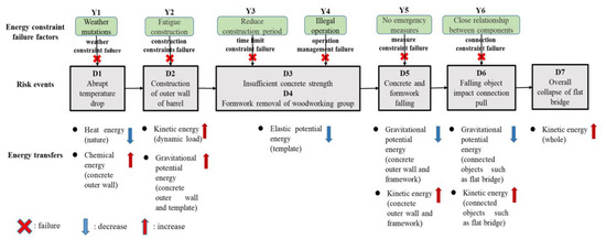 The theory of energy transfer discusses the mechanism of accidents caused by energy transfer in engineering from the perspectives of physics, engineering, and management. Changes in the transfer of dangerous energy are considered to underlie accidents; consequently, restricting the transfer of dangerous energy is the most effective way to prevent accidents. Therefore, by establishing the evolution model of the energy constraint failure analysis and the evolution model of the energy transfer change, the process of the horizontal energy transfer change was analyzed in detail (Figure 5). The analysis of this model demonstrated that only by restraining and blocking the generation and transfer of dangerous energy it is possible to effectively control and reduce the occurrence of serious safety accidents. The FPCA had seven risk events (D1–D7) and six energy constraint failure factors (Y1–Y6). The detailed energy analysis process of this event is shown as follows.