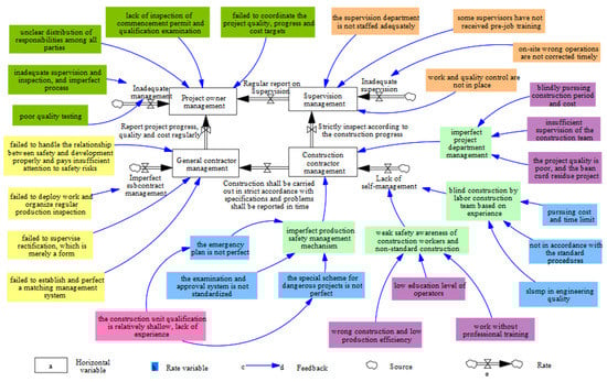 As shown in Figure 7, more intuitive symbols have been used to describe the logical relations between system elements and to clarify the feedback and control styles of the system. Different colors were used to distinguish management factors of different horizontal variables. From the participants’ perspective, by analyzing the causal loop diagram, the model presents that the horizontal variables in the entire system include the management of the project owner, the supervisor, the general contractor, and the construction party (sub-contractor). Rate variables include insufficient management, insufficient regular reporting and monitoring, imperfect subcontracting management, and lack of self-management, etc. The remaining variables are the auxiliary variables (constants). Further, based on the SD model with different types of variables distinguished, the establishment of mathematical relations between various variables for computer simulation can be supported. In this way, a more quantitative and accurate analysis can be achieved. Accident management factors, based on the main dynamic evolutions of the management factor system, are analyzed as follows.