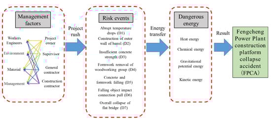 This study is an important investigation on the evaluation of safety risks of construction projects, by delineating the entire evolution stage of a construction accident. Specifically, a novel approach and comprehensive analysis method were proposed. The mechanism of the FPCA was systematically analyzed based on the ETM from the technological perspective. The SD theory was used for constructing the network diagram of the accident management factors and for analyzing the network structure, to explore and understand the change processes, essential characteristics, and the complex characteristics of accident management from the management level. This research demonstrated that the collapse accident was essentially associated with the transfer of dangerous energy, caused by the failure of a series of energy constraints. Thus, the construction platform’s gravitational potential energy and chemical energy were converted into kinetic energy after the failure of the construction constraints. Moreover, the failure of the kinetic energy constraint led to the collapse accident. The analysis of the network structure of management factors before the accident further verified that the aforementioned project management was the key to the project’s safety control. Strengthening supervision and management and blocking the transfer of dangerous energy could have effectively reduced the connectivity of the accident-related network. It is expected to provide a useful reference for understanding the processes underlying the occurrence, risk management, and prevention of engineering accidents.