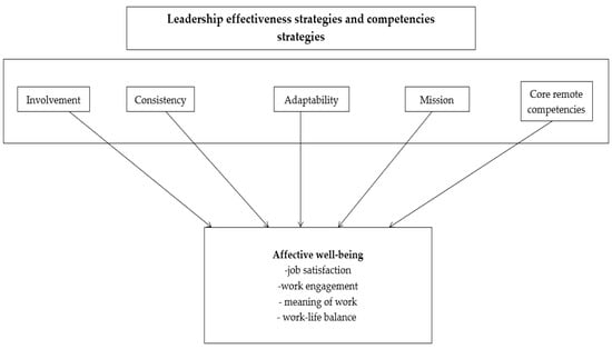 Leadership effectiveness strategies and core remote competencies were adopted as independent variables in the analysis; each strategy was considered separately (12 strategies and 4 key competencies). The variables were analysed as the following main traits: leadership consistency, leadership involvement, leadership adaptability, leadership mission and core remote competencies. Affective well-being was adopted as a dependent variable.