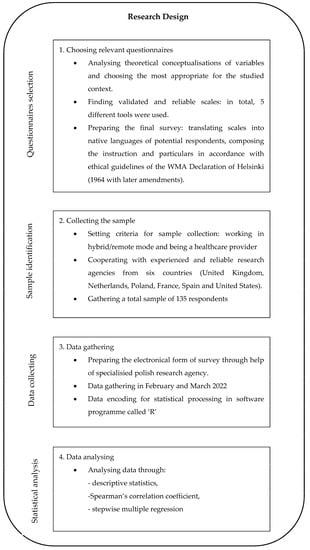 To verify the stated hypotheses, primary data were collected through an accurately planned research design. It was crucial to find respondents meeting two criteria: working in a hybrid mode and being a healthcare specialist. It was also important to have an international sample so as to be able to draw conclusions in an extended context. Because of this, non-probability sampling was chosen, and the selection of respondents was done with help from reliable research agencies operating in six different countries. Respondents were asked to complete a survey composed of five questionnaires (one connected with the assessment of leaders’ behaviours and competencies and four validated scales devoted to affective well-being components). Subsequently, quantitative data emerging from conducted surveys were analysed through statistical methods. As a consequence, results obtained were interpreted, and a leadership model showing strategies and competencies enabling an increase in the affective well-being of healthcare providers was proposed. The methodological process is illustrated in Figure 2.