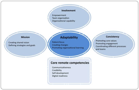 In order to verify which leaders’ behavioural strategies increase the level of affective well-being, the Denison Model was adopted, which focusses directly on leadership strategies that influence organisational effectiveness and involve the main organisational culture traits: involvement, consistency, adaptability and mission [24], However, we have noticed the need to supplement the model with leadership competencies that are fundamental and universal for all areas and that enable the implementation of behavioural strategies within the four leadership traits. Therefore, we add four additional competencies [25], which, in our opinion, hold together all dimensions of leadership effectiveness, especially in the context of remote work. As today’s leaders of hybrid teams need to focus on building trust and credibility, taking care of the dynamics of organisational development, virtual team cooperation and effective communication, the universal competencies include communication—one of the basic and most important managerial competencies in healthcare [22,50,51], which, according to healthcare workers, improves their well-being [3,61]—and credibility, also considered to be the foundation of effective leadership in healthcare because it allows for ‘getting things done’ by building recognition and integrity [22] and because it improves the affective well-being of medical workers [3]. Self-development was also added to the model as a basis for novel development opportunities and openness to new solutions. It is also a key competence that increases the effectiveness of leaders in healthcare [54]; along with digital readiness, understood as cognitive openness to new technologies, a proactive approach to digital transformation and a focus on learning new methods of communication and cooperation in the virtual world [25], it is a response to the need for new technologies in healthcare, which should be openly approached by leaders [51]. The conceptualisation of leadership effectiveness strategies, including the four additional competencies, is presented in Table 1.