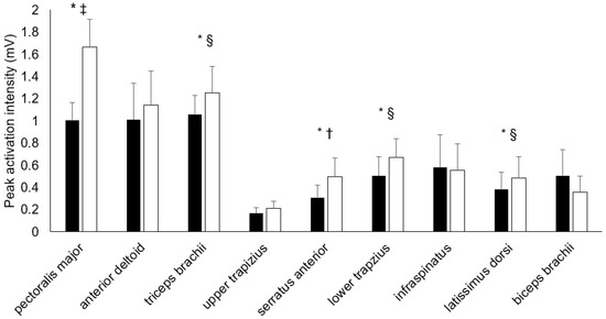 Mean peak sEMG amplitudes for each muscle during the bar dip in non-fatigued (black) and fatigued (white) conditions. * indicates a significantly greater muscle activation intensity in the fatigued condition, § indicates a small effect size (d > 0.2), † indicates medium effect size (d > 0.8), ‡ indicates a very large effect size (d > 1.2). A Wilcoxon signed-rank test was used for the upper trapezius, serratus anterior, and biceps brachii.