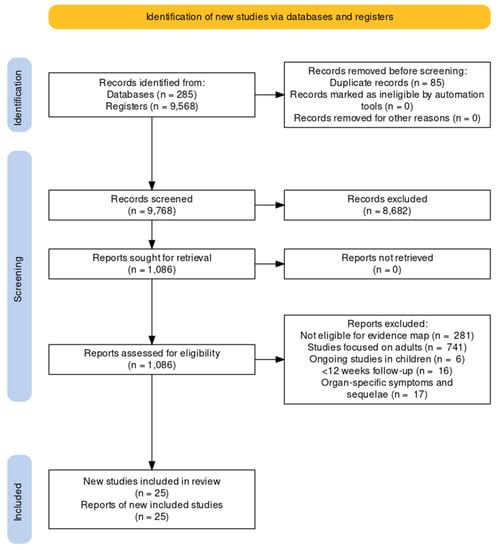 We screened 9768 results from de-duplicated retrieved records to populate our evidence map. After excluding those that focused on adults and those not meeting our eligibility criteria for this review, we identified 25 studies, including over 68 thousand children and adolescents (this is an estimate since case-mix studies did not provide the exact number; see Table 1 for a summary of the main characteristics and Figure 1 for a PRISMA flow chart and see our OSF project page for the full details of the excluded studies) [23,24,25,26,27,28,29,30,31,32,33,34,35,36,37,38,39,40,41,42,43,44,45,46,47,48,49]. Most studies were available as journal articles (all in English), 84% had a longitudinal design, and six had a control group [7,23,29,30,39,41,45]. The vast majority of studies were conducted in high-income countries and included children and adolescents with mild to moderate disease from the first waves of the pandemic. None of the studies focused on socially vulnerable participants, participants with chronic conditions or those vaccinated for COVID-19. Over half of the studies (52%) included a case mix of children and adults. Eight studies described the presence of comorbidities in children and these primarily included neuropsychiatric disorders (anxiety, depression, ADHD, autism), allergic rhinitis, asthma and eczema [25,28,29,30,34,35,36,42,43]. We reported the disaggregated data for children when available. None of the included studies assessed the pre-defined outcome ‘survival’. We have also identified six additional ongoing studies on children and adolescents from our evidence map.