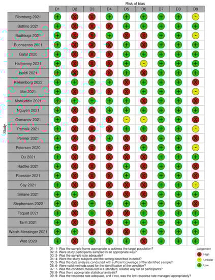 We assessed the risk of bias in each study using the JBI tool for prevalence studies [19]. This tool assesses nine domains, including sampling frame, sampling method, sample size, description of participants, data analysis coverage, validity and reliability of the measurement of the outcome, statistical methods and response rate.