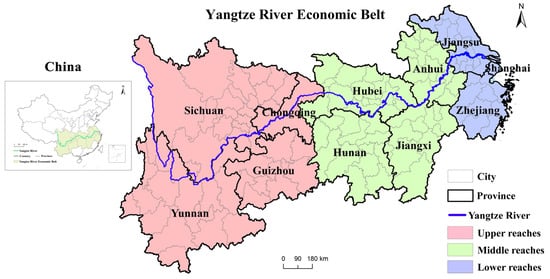 The Yangtze River is the largest river in Asia []. The Yangtze River Basin is a large economic belt with the largest population, largest industrial scale, and most complete urban system worldwide []. The research setting (Figure 1) includes 130 cities in nine provinces, and two municipal districts in the upper (Chongqing, Sichuan, Yunnan, and Guizhou), middle (Hubei, Hunan, Jiangxi, and Anhui), and lower (Shanghai, Zhejiang, and Jiangsu) reaches. It comprises three important national city groups (Chengdu-Chongqing, Yangtze River midstream, and Yangtze River Delta urban agglomerations) and regional urban agglomerations (e.g., the central Yunnan and Guizhou city groups). Its population and economy exceed 40% of the country’s total. The eastern, central, and western regions of the belt differ []. The eastern region accounts for 10.34% of the land area, with a high import and export trade volume of 80.28%. Therefore, the Yangtze River Economic Belt is adequate for regional development differences and coupling coordination [].