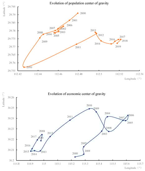 The spatial evolution and coupling situation of the population and economic center of gravity were measured based on the attributes and geographic data of the spatial unit of the Yangtze River Economic Belt from 2000 to 2019 (Figure 5). The reasons for the change and its relationship with the balanced development of regional space were analyzed. The spatial coupling situation of the population and economic center of gravity conforms to the “inverted U-shaped” curve; that is, the population and economic center of gravity present a process of separation and then convergence, and the difference in regional development shows a trend of first expanding and then shrinking. The moving range of the economic center of gravity (68.04 km) is greater than that of the population center of gravity (9.10 km), with the “Hu Huanyong Line” likely having spatial stability.