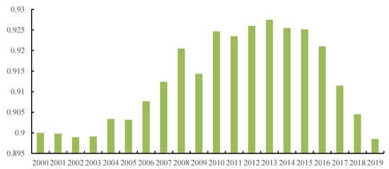 The coupling coordination degree of population and economy in the Yangtze River Economic Zone generally shows a rising trend after fluctuations (Figure 6) from 0.890 in 2000 to 0.927 in 2013, and a drop to 0.910 in 2019. It shows that the distribution of population and economy in the Yangtze River Economic Belt gradually balances over time and then becomes unbalanced. From 2000 to 2003, the coupling and coordination of population and economy slowly declined because agriculture dominated most of the Yangtze River Economic Belt at the beginning of the 21st century, with low economic development, low urbanization, and excessive population, which restricted economic development. The population–economy contradiction is sharp, and the degree of coupling and coordination declined. The global economic situation was good from 2003 to 2008, and the Yangtze River Economic Belt ushered in a golden period of rapid growth. Under the guidance of regional background development conditions, the economic growth of large cities and provincial capitals was faster than that of small cities, and labor-intensive enterprises attract population agglomeration. Living standards, lifestyles, and education and fertility concepts have, meanwhile, changed with economic development, population numbers were under control, and the population–economy contradiction eased. The industrial structure adjustments, urbanization transformation, and educational reform continuously promote the coordinated development of the population economy, and the degree of coupling and coordination show a rapid growth trend. In 2009, given the changes in the external environment and the financial crisis, production cost increased, and the degree of coupling and coordination declined concavely []. After 2013, the economic growth slowed down. Given regional development environment and industrial transfer changes, the economic development did not attract rapid population agglomeration and transfer in underdeveloped areas. The population and economy gradually became unbalanced, with regional differences remaining. Improvement in the economic development stage promotes the coupling and coordination upgrading of the population and economic system. However, the complex relationship between population and economic system may make the coupling and coordination degree repetitive.