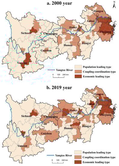 There remain significant spatial differences in the coupling coordination degree pattern of the Yangtze River Economic Belt, which can be divided into three types: population-leading, coupling coordination, and economic-leading (Figure 7). From 2000 to 2019, the population and economic coupling coordination types were mainly economic- and population-leading types, accounting for 33.84% and 58.46% of the total, respectively. The coupling coordination type accounted for 7.7%. The economic-leading type is mainly distributed in the Yangtze River Delta, Chengdu-Chongqing, and Chang-Zhu-Tan urban agglomerations. Given urbanization and industrialization, the region has seen rapid socio-economic development while attracting large populations. However, given the impact of the household registration system, population transfer is not complete, population attraction has a certain lag, and the economic concentration rate is faster than the population concentration. Population-leading cities are mainly distributed in provinces such as Yunnan, Guizhou, and Sichuan with poor economic foundations and backward economic development but with a high population growth rate. Furthermore, the population employment structure lags the industrial structure. Alternatively, the population quality is not high enough to meet the needs of economic development. From the perspective of spatiotemporal evolution, during the 2000–2019 period, the main structure of the coupling and coordination of the population and economy has not changed, but the spatial distribution and quantity of various types have changed, mainly from the original coupling and coordination type reduction to economic leading type, accounting for 4.62% of all types.