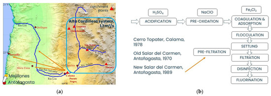 (a) Catchments points that feed the three WTPs located in Antofagasta (Old and New Salar del Carmen) and Calama (Cerro Topater); (b) Scheme of the treatment train of the three WTPs.