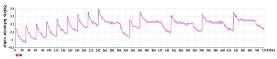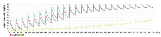 In the passive intervention model, the values of safety behavior could remain above 0.2 for a long time after several interventions (where the level of values is slightly greater than 0.2), during which there are no intervention measures, making workers relaxed and idle. In this regard, we introduced the complete forgetting mechanism. When there was no intervention for more than 60 consecutive days, its attenuation rate became the initial state, controlled by cyclic Event 7.