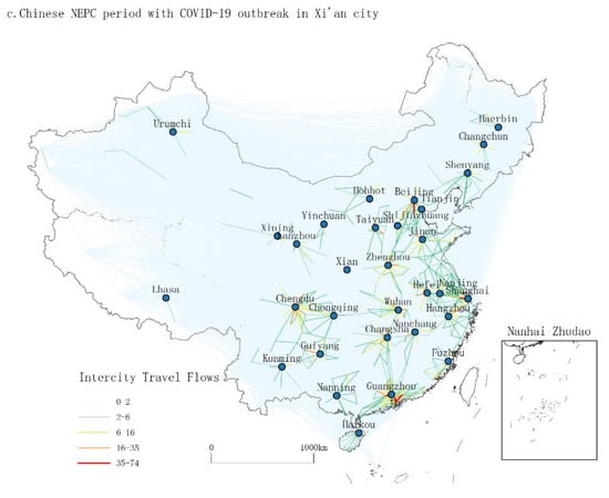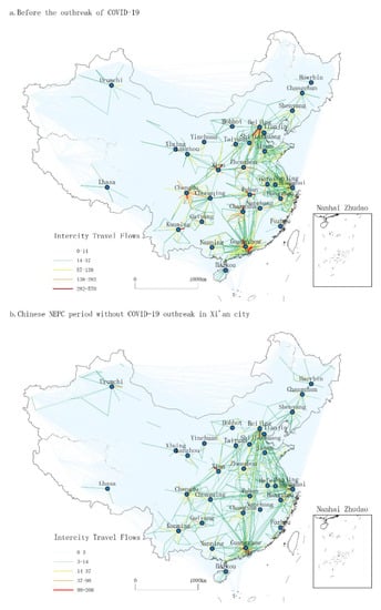 43]. In contrast, the overall size, intensity, and distance of intercity travel in China during the NEPC period (