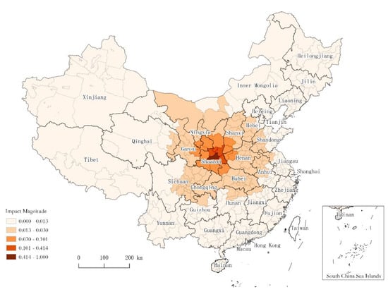 Figure 3, using the administrative divisions of the cities as boundaries. In the figure, with Xi’an as the center of the circle, the impact of the Xi’an outbreak on intercity travel is found to radiate in a “ripple” pattern. The inhibitory effect on travel decreases with increasing distance, centered on the location of the outbreak. A closer analysis of the data shows that the localized epidemic in Xi’an has a broader and more severe impact on intercity travel in eastern cities than in western regions. This may be explained by the fact that eastern China tends to have regions with more plains, while the terrain west of Shaanxi Province gradually elevates. Moreover, the economy of eastern cities is relatively more developed than that of western cities, and intercity communication is more frequent in the east, making it easier for the epidemic to spread, and so the eastern region is hit more by the epidemic. In addition, it is found that some areas such as Aba Tibetan and Qiang Autonomous Prefecture in Sichuan Province, though not far from Xi’an in terms of actual geographic space, are less affected by the epidemic because they are located on the Qinghai-Tibetan plateau with high altitude and sparse population to hinder the spread of diseases.