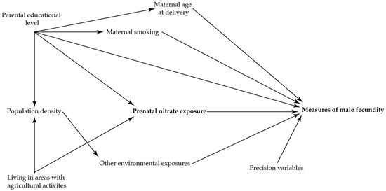 Directed acyclic graph illustrating the suggested associations between nitrate concentration in maternal drinking water and the reproductive health in the adult sons.