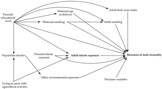 Directed acyclic graph illustrating the suggested associations between nitrate concentration in the adult sons’ drinking water three months prior to the clinical examination and the reproductive health in the adult sons.