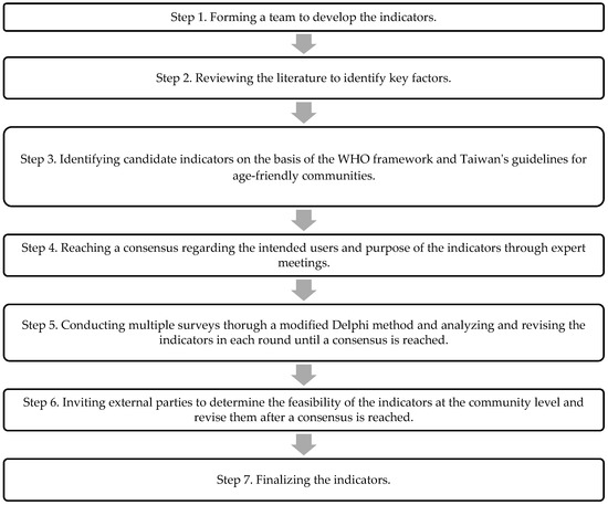 To avoid the time-consuming process of distributing multiple questionnaires, which may have indirectly affected the results, we explained our objectives and the purpose of the indicators to the team during the expert meeting [30] and conducted three expert opinion surveys. The team reviewed each candidate during the meeting to ensure that they would be useful and effective at the community level and that they would enable the bottom-up development of age-friendly communities. The team discussed the role of users, indicator standings, and the indicators’ purpose. During the meeting, the team concluded that the indicators should be explained in plain language to facilitate usage at the community level and conform to international standards. For this reason, all eight factors from the WHO framework were retained. The indicators were then developed through a modified Delphi method.