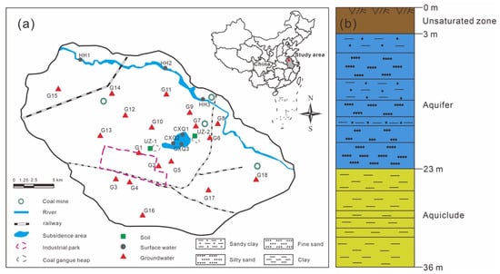 (a) Map of the study area. Surface water, groundwater, and soil samples are shown as gray closed circles, red closed triangles and green closed squares, respectively. The coal mining area is shown as blue open circles. (b) Hydrogeological cross section of the study area. The unsaturated zone, the first aquifer and the first aquiclude mainly occur at depths of 0–3 m, 3–23 m and 23–36 m in the unconsolidated Cenozoic strata.