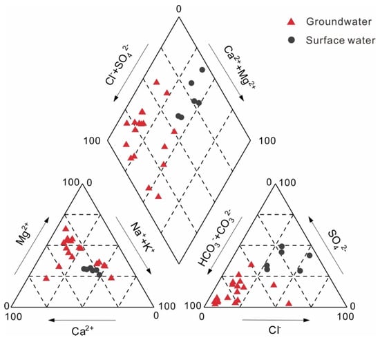 The piper diagram of surface water and groundwater samples in the mining area. The arrows point from high ion content to high ion content in water.