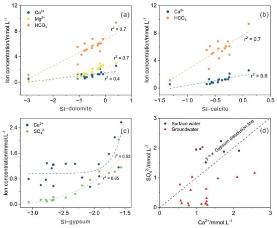 Relationship diagrams for major ions in surface water and groundwater samples: (a) correlations of SI−dolomite and related ions; (b) correlations of SI−calcite and related ions; (c) correlations of SI−gypsum and related ions; (d) scatter plot of Ca2+ and SO42−.