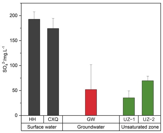 The SO42− concentrations of surface water, soil profiles, and groundwater are shown in Table 2 and Figure 4. Chen et al. [45] found that the mean SO42− concentration was 386.7 mg/L in the rivers of the Huaibei coalfield between 2015 and 2017. In contrast, the mean SO42− concentration in the surface water was slightly lower at the present site, and the temporal variation in SO42− in the surface water was large. The sulfate concentration of the unconsolidated aquifer varied only slightly [39]. The sulfate concentrations of G2 (98.85 mg/L), G3 (97.67 mg/L) and G13 (111.53 mg/L) were higher than those of other groundwater samples, as these samples were affected by industrial wastewater and domestic sewage from the industrial park. Sampling point G6 (195.13 mg/L) had the highest sulfate concentration, mainly due to the weathering and leaching of the gangue heaps and dissolution of evaporite. The SO42− concentrations of the soil profiles (UZ−1 and UZ−2) increased slightly with soil depth to reach maximum values at 200 cm (Figure 4). The uppermost part of the Cenozoic section is recharged directly by atmospheric precipitation. In addition, the upper stratum has favorable factors, such as good sorting and small compactness, so the runoff conditions are good, and elements can easily migrate. Leaching results in a higher sulfate concentration in the UZ with increasing depth. The SO42− concentration (water−soluble sulfate and adsorbed sulfate) of the soil solution in the Linhuan mining area ranged from 11.08 to 59.18 mg/L (mean 25.38 mg/L) in 2019 [46]. Compared with the previous data, there was a distinct SO42− enrichment phenomenon in the UZ−1 profile and UZ−2 profile. The SO42− concentration of the UZ can be affected by seasonal variations, fertilization and organic sulfur mineralization, as well as by atmospheric deposition and coal gangue accumulation [47].