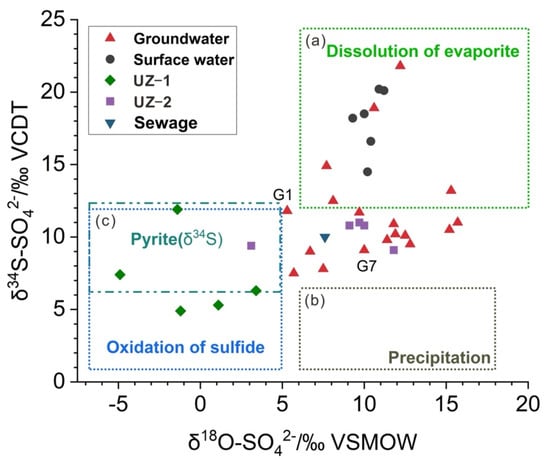 Compositions of δ34S−SO42− and δ18O−SO42− in the study area. The typical values of δ34S−SO42− and δ18O−SO42− for (a) dissolution of evaporites ranged from δ34S−SO42− = +12‰ to +35‰, δ18O−SO42− = +6‰ to +20‰; (b) atmospheric precipitation ranged from δ34S−SO42− = −5‰ to +6‰, δ18O−SO42− = +6‰ to +18‰; and (c) oxidation of sulfide ranged from δ34S−SO42− = −18‰ to +12‰, δ18O−SO42− = −5‰ to +5‰ [21,56,57].