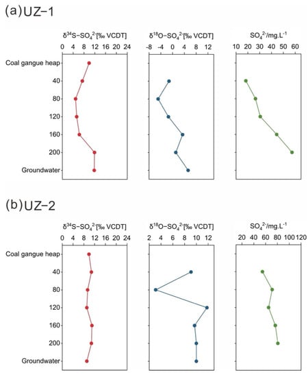 Mining activities have resulted in large quantities of coal gangue and large areas of subsidence area water. Sulfate from the sulfide oxidation of coal gangue and subsidence area water may penetrate into groundwater through the unsaturated zone. The sulfide minerals in coal gangue are mainly found in the form of pyrite [62,63]. The environment caused by the damage of strata by mining activities is favorable for the oxidation of sulfides (pyrite) in coal gangue. Sulfide oxidation usually results in minimal S isotopic fractionation [64,65], basically preserving the original isotopic composition of the sulfide minerals. However, the oxygen in water and the atmosphere participates in sulfide oxidation in different proportions, resulting in the extremely complex behavior of δ18O−SO42− [66]. In Figure 5, the δ34S−SO42− values of most UZ samples were close to the δ34S−SO42− range (+6.3‰~+13.5‰, mean 9.9‰) of the precursor sulfide minerals (pyrite) in the coal mine area, as reported by Chen et al. [21], indicating that the δ34S−SO42− signatures resulted from the oxidation of sulfide. The mean pyrite δ34S−SO42− value (9.9‰) of the gangue samples collected in the Linhuan mining area by Chen et al. [21] and δ34S−SO42- and δ18O−SO42−- values of the soil profiles (UZ−1 and UZ−2) collected near the gangue heaps and groundwater sampling points (G1 and G7) closest to the profiles were used to reveal the migration process of sulfate in the UZ and sulfate sources in the groundwater (Figure 6). As shown in Figure 6b, the δ34S−SO42− values of the UZ−2 profile and groundwater sampling point G7 were very similar to the average δ34S−SO42− value of pyrite in the coal gangue. Meanwhile, the δ34S−SO42− values formed a narrow range from +9.1‰ to +11.0‰, and the SO42− content showed an increasing trend with increasing depth of the profile. Figure 6a shows that the variation characteristics of δ34S−SO42− values in the UZ−1 profile at depths of 40−160 cm were similar to those of the UZ−2 profile. This phenomenon in the UZ profiles indicated that oxidation of pyrite occurred in the coal gangue and that the resulting SO42− vertically migrated in the UZ. Yang et al. [46] found that the soil pH value of the subsidence area in Linhuan was generally low, and most of it was under acidic conditions. The soil near the gangue heaps showed higher levels of organic matter and sulfate content than the soil far away from the gangue heaps. Jiang et al. [67] also found that the concentrations of Fe ions in the shallow groundwater near gangue heaps in the mining area were higher than those in other areas. The higher Fe level may be due to the pyrite oxidation of the coal gangue. These studies further indicated that pyrite oxidation was the source of sulfate in groundwater near gangue heaps.