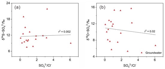As seen in Figure 7, no significant trend was observed between the δ34S−SO42− and δ18O−SO42− values and SO42−/Cl− in the groundwater. Additionally, the mean value of DO in the groundwater was 4.35 mg/L, which also verified that the redox conditions were insufficient to achieve the reduction of SO42− [75]. All these results confirmed that BSR did not significantly change the original isotopic composition of the sulfate sources in the groundwater.