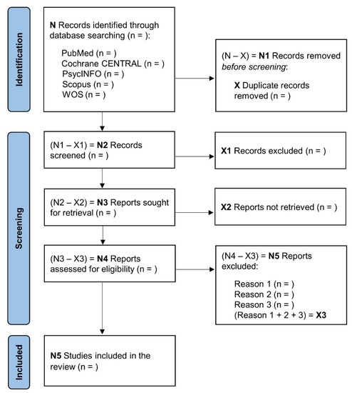 The systematic search will be conducted in MEDLINE (PubMed), Cochrane CENTRAL, PsycINFO, Scopus and Web of Science from database inception until 30 September 2022. Additional searches will be performed in the International Clinical Trials Registry Platform and the ClinicalTrials.gov websites to capture any study not covered by the main search. Further studies will be identified by screening the reference lists of the included studies and relevant reviews for potential relevance. The authors will be contacted in case of a lack of data. The electronic database searches will be limited to keywords, title, and abstract. The search strategy (Table 1) will involve a set of free text terms grouped from the PICO strategy. The search will first be carried out in MEDLINE and will subsequently be adapted to the other databases. No limits will be applied to the study language. In the case of non-English language articles, Google translate will be used to assess the eligibility of article abstracts, and those studies deemed eligible for full-text assessment will be translated by nonprofessional translators (i.e., volunteer researchers), by the University language department, or by professional translators who are native speakers of the language if necessary.