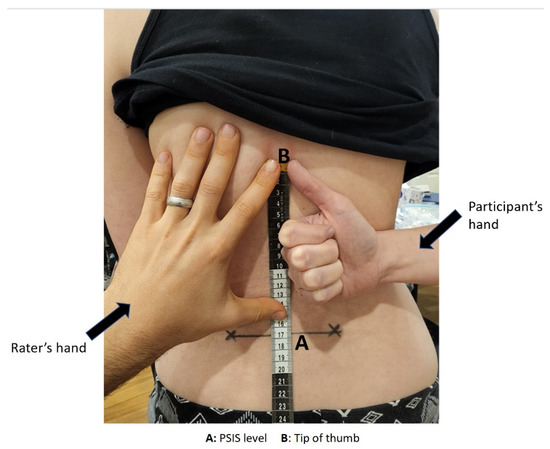 HBB was measured using a tape measure and non-permanent marker with the identical testing protocol of van den Dolder et al. [29]. The raters identified each PSIS on the participant and connected both by drawing a horizontal line. Participants were instructed to “take your arm as far as you can go,” and the distance between the level of the PSIS and thumb tip was measured in centimetres (Figure 3). The difference in ROM between the dominant and non-dominant sides was recorded, with a lower number indicating a poorer ROM. If a participant could not reach the PSIS level, the distance from that point was recorded as a negative value.