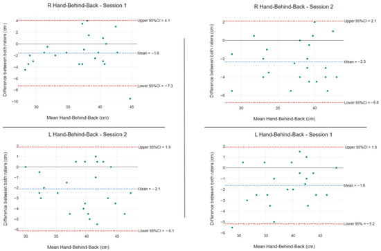 The mean HBB differences between raters were −1.6 cm and −2.1 cm in session one and −2.3 cm and −1.6 cm in session two. All ROM values were distributed sparsely and not strongly concentrated along the horizontal axis (Figure 6).