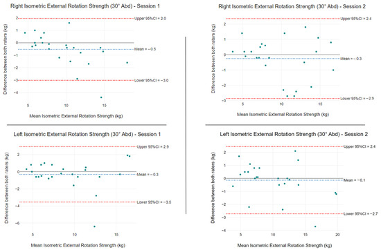 At 45° of abduction, the mean isometric ER strength differences between raters were 0.3 kg (LoA: −2.5 kg to 3.0 kg) and −0.1 kg (LoA: −1.9 kg to 1.8 kg) for session one, and 0.4 kg (LoA: −1.8 kg to 2.5 kg) and −0.1 kg (LoA: −2.7 kg to 2.4 kg) for session two (Figure 8).