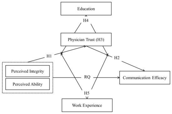 Self-efficacy is a key concept in social cognitive theory because it links predictive knowledge with decision-making and behaviors [47]. It could be the abovementioned missing piece of the puzzle. That is, it could explain the possible cognitive cause of objective medical and relational outcomes: The physician’s (dis)trust does not directly result in certain medical or relational outcomes, but rather does so indirectly through the physicians’ communication efficacy and consequential communication. While the authors of the existing literature mainly believe that physicians’ effective communication relies on communication skills, and therefore stress the cultivation of skills, the skills are performed better when physicians have higher trust and confidence levels in themselves with respect to successfully performing communication behaviors; that is, they have higher communication efficacy [48,49]. The physician’s trust in the patient determines their enacted trust and is closely associated with their self-trust [11]. In this vein, a physician’s trust in the patient is expected to influence their communication efficacy. H2, H3, and the research question were, therefore, proposed as follows: