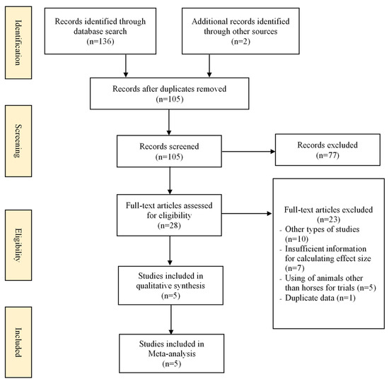 Exclusion criteria were: (i) the use of animals other than horses for trials; (ii) insufficient information for calculating the effect size (ES); (iii) case studies, observational studies, or review articles; (iv) duplicated study.