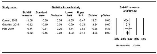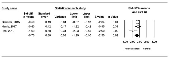 The pooled meta-analysis results from the three studies in Figure 9 showed that horse-assisted therapy produced a significantly positive effect on hypersensitivity in children with ASD (SMD = −0.70, 95% CI [−1.29, −0.10], p = 0.02).
