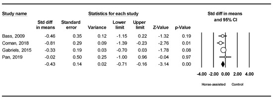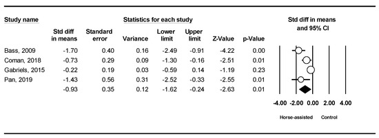 The pooled meta-analysis results from the four studies in Figure 3 showed that horse-assisted therapy significantly improved social awareness in children with autism (SMD = −0.93, 95% CI [−1.62, −0.24], p < 0.001).