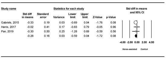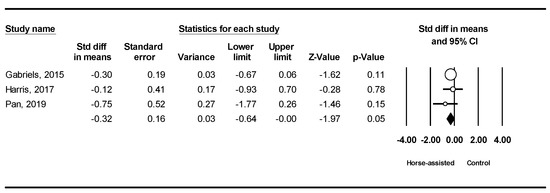 Among the five studies included, the pooled meta-analysis results from the three studies in Figure 8 showed that horse-assisted therapy produced a significantly positive effect on lethargy in children with ASD (SMD = −0.32, 95% CI [−0.64, −0.001], p = 0.049).