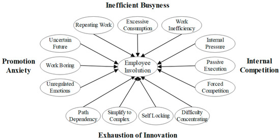 Employee involution includes four dimensions: inefficient busyness, exhaustion of innovation, promotion anxiety, and internal competition. (1) Inefficient busyness is the behavioral manifestation of employees’ involution, including repeating work, excessive consumption, and work inefficiency. The specific manifestation is that employees are in a state of excessive work consumption and stay in a state of inefficient self-repetition for a long time; (2) Exhaustion of innovation is the cognitive performance of employees’ involution, including four aspects: path dependence, simplify to complex, self-locking and difficulty concentrating. Due to the limitations of cognition, when employees are faced with complex decisions, their thinking patterns will rely on past scenarios to make explanations and reactions. When employees cannot expand or change themselves, they will only develop in the direction of internal complexity. Even though the work is very complicated, it is always copying itself, lacking the desire and motivation for innovation; (3) Promotion anxiety is the emotional manifestation of employees, which includes three aspects: uncertain future, boring work, and unregulated emotions. Boring, repetitive work, difficulty in improving work efficiency, and low level of competition make employees’ negative emotions increasingly prominent; (4) Internal competition is the performance of employees’ involution in motivation, including internal pressure, passive execution, and forced competition. In most organizations today, the dense internal environment forces employees to participate in increasingly intense competition and experience continuous pressure but cannot quit. The theoretical model of the involution influence factor is shown in Figure 1.