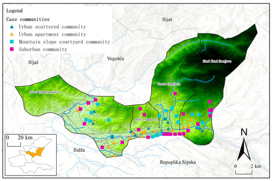 In accordance with the requirements of the local government, these case communities are all included in the zones where local epidemic control and management measures can be carried out, the same as other communities in the area, to implement the epidemic prevention and control requirements. In Lanzhou, the typical communities in the main urban areas of the city, namely Chengguan District, Qilihe District, Anning District, and Xigu District, were selected for investigation (Figure 1, Table A1). In regard to Sarajevo city, we selected typical communities in Centar Sarajevo, Novi Grad Sarajevo, Novo Sarajevo, and Stari Grad Sarajevo to investigate (Figure 2, Table A2). In each district, in order to ensure the comparability, comprehensiveness and validity of the samples, 4–8 communities of different types were selected in each district of the urban space.